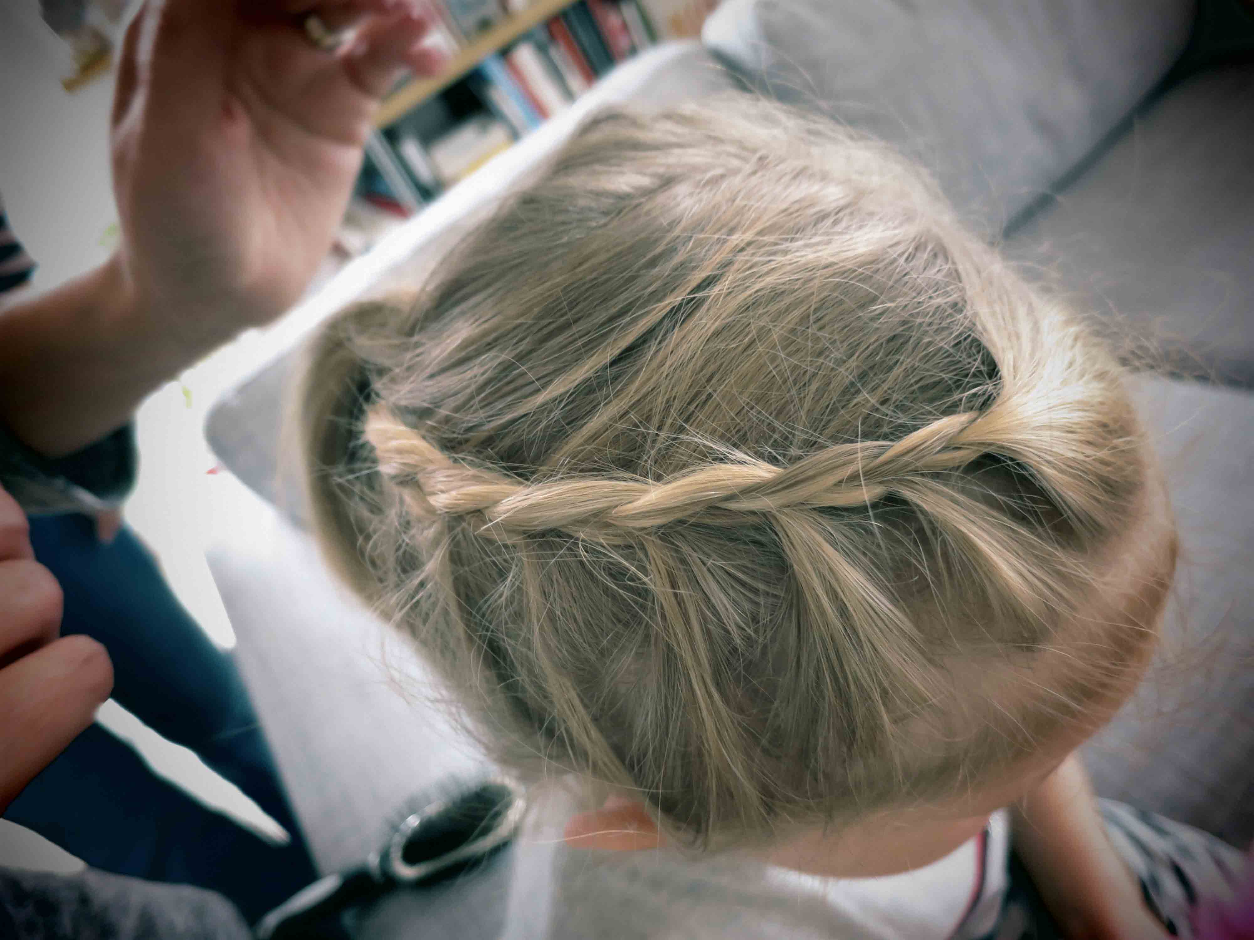 Vous pouvez terminer par une tresse ou une couette ou même faire la pareil de l’autre côté . A vous de voir .