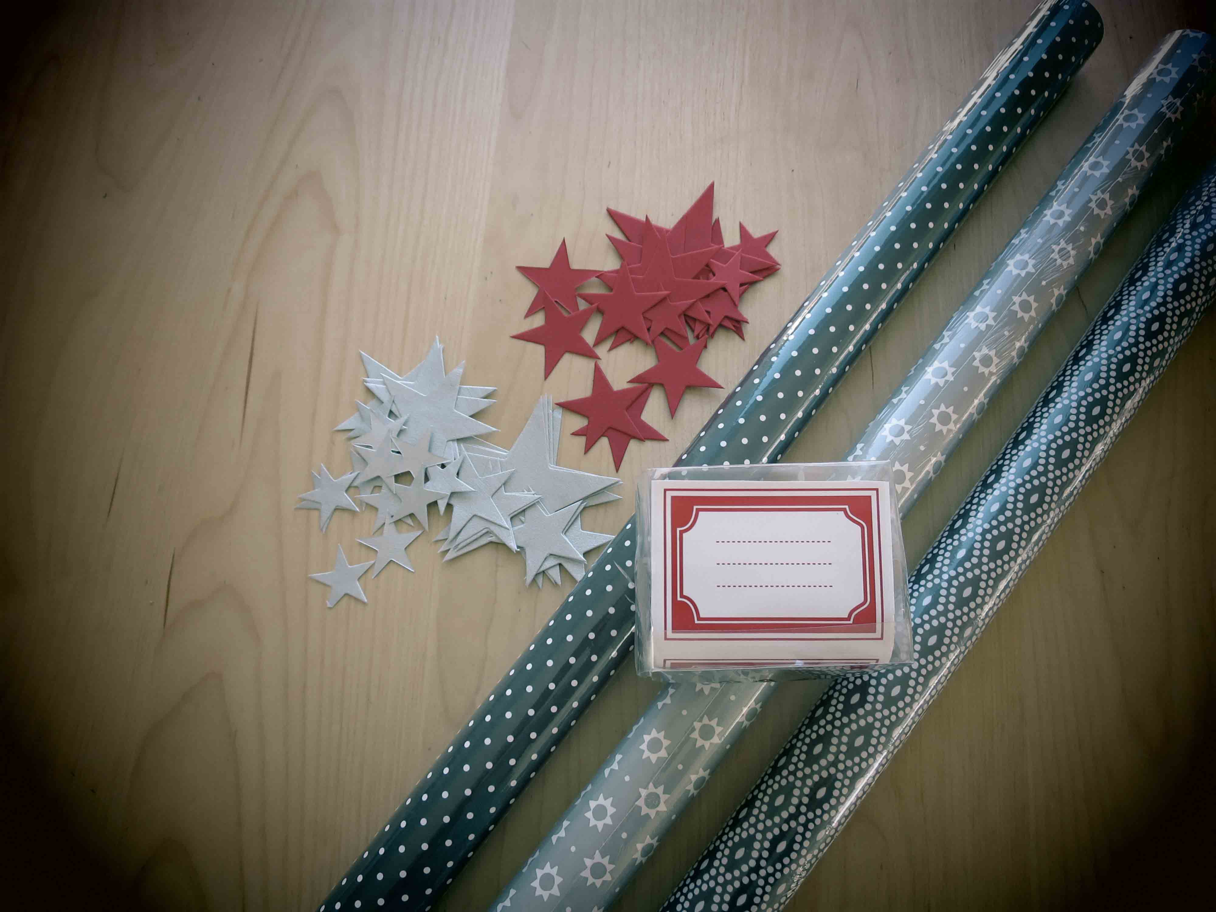 j’ai aussi pris de quoi emballer les cadeaux de noël ( oui je sais j’ai encore presque 3 mois ), rouleaux de papier, étoiles , étiquettes , et je me suis arrêtée là car le reste était en train d’être mis en place dans les rayons.